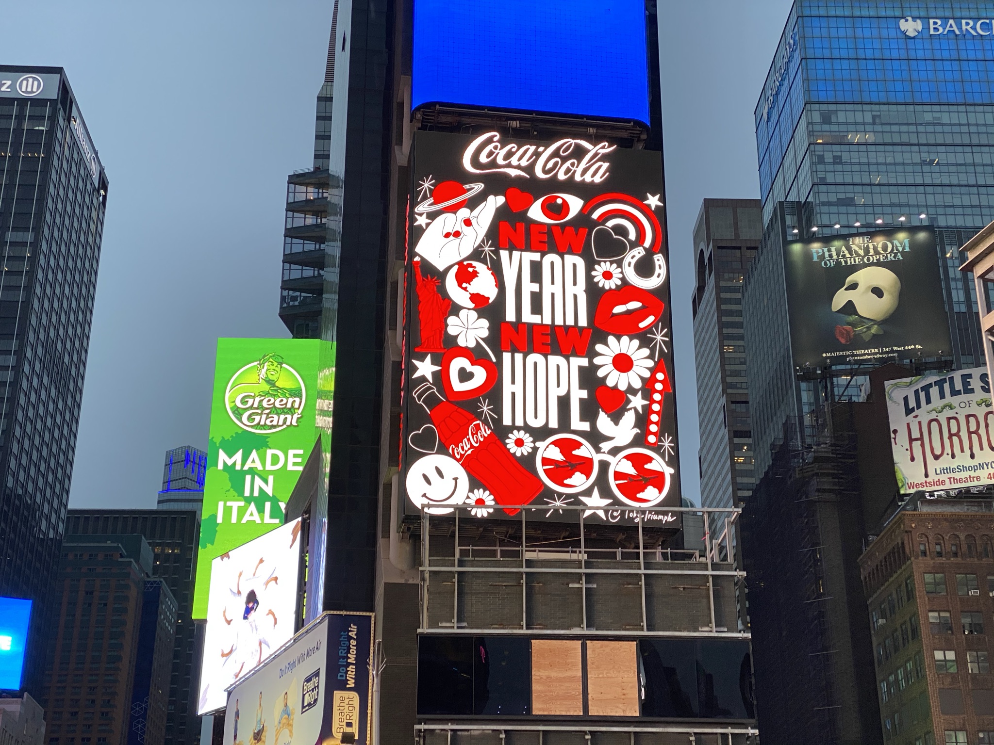I was asked by the folks at Coca Cola to create a piece of artwork to see in the New Year on their billboard in Times Square New York City. 2020 was a real stinker, let’s not beat around the bush, so they wanted to create an illustration that was hopeful and looking forward to more positive things in 2021. It was such a buzz seeing my illustrations up in Times Square (see the pic below), and as a sign of my thanks I have drunk nothing but Coca Cola since New Years Eve! Here’s to a better 2021!